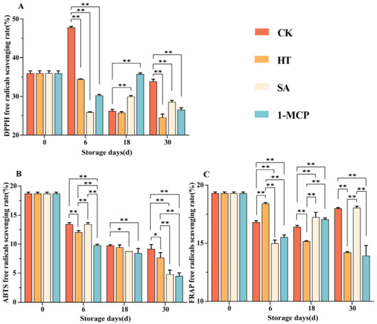 Changes in DPPH free radicals scavenging (A), ABTS free radicals scavenging (B) and FRAP free radicals scavenging (C) in fruit pulp during storage. “**” means the result of significance analysis is highly significant (p < 0.01), “*” means the result of significance analysis is significant (0.01 < p < 0.05).
