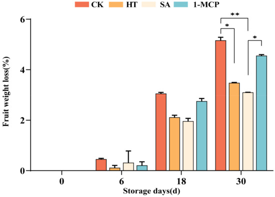 Effect of different treatments on the rate of fruit weight loss during storage. “**” means the result of significance analysis is highly significant (p < 0.01), “*” means the result of significance analysis is significant (0.01 < p < 0.05).
