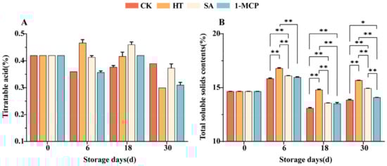 Changes in the titratable acid (A) and total soluble solids contents (B) of fruit pulp during storage. “**” means the result of significance analysis is highly significant (p < 0.01), “*” means the result of significance analysis is significant (0.01 < p < 0.05).
