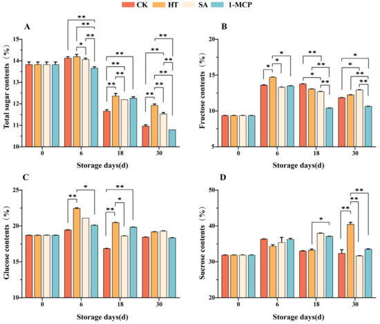 Changes in total sugar (A), fructose (B), glucose (C) and sucrose (D) contents of fruit pulp during storage. “**” means the result of significance analysis is highly significant (p < 0.01), “*” means the result of significance analysis is significant (0.01 < p < 0.05).
