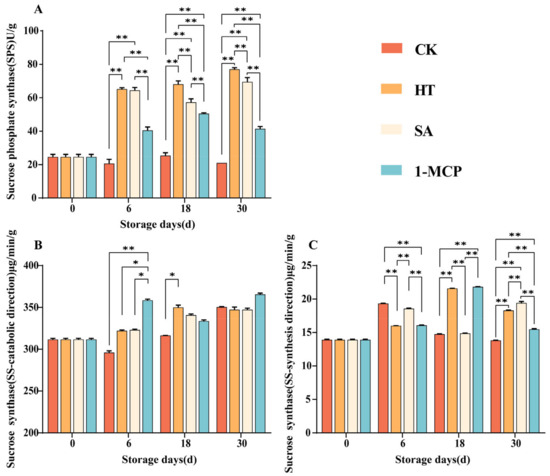 Changes in SPS (A), SS synthesis direction (B) and SS catabolism direction (C) enzyme activities in fruit pulp during storage. “**” means the result of significance analysis is highly significant (p < 0.01), “*” means the result of significance analysis is significant (0.01 < p < 0.05).
