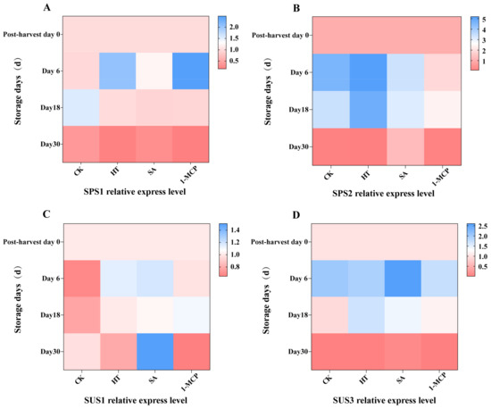 The expression peaks of SPS2 and SUS3 were relatively high, while those of SPS1 and SUS1 were relatively low. This suggested that SPS2 and SUS3 might play more important role during the storage process (Figure 8). The expression levels of SPS1 and SPS2 exhibited an increasing and then decreasing trend. In the early stage of storage, the expression of SPS1 and SPS2 was higher in the treatment groups compared to the control (CK), while in the late stage, their expression levels decreased. It was speculated that exogenous substances might be involved in gene induction through alternative pathways. In the different treatments, the expression of SUS1 was higher than that in the CK group, while in the late stage, the expression in was lower in all treatments except SA. The expression of SUS3 also showed an increasing and then decreasing trend. Except for SA, other treatments partially suppressed the expression of this gene in the early stage of storage, which is consistent with the trend of enzyme activity in the SS catabolic direction. However, in the late stage, SUS3 expression was almost negligible, suggesting that SUS3 primarily regulates SS catabolic activities. Notably, the SA treatment significantly inhibited the reduction in SUS1 and SUS3 expression.