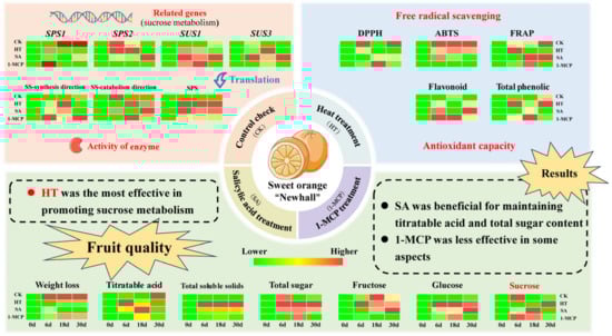In this study, we comprehensively investigated the effects of various postharvest treatments, including control check (CK), heat treatment (HT), salicylic acid treatment (SA) and 1-methylcyclopropene treatment (1-MCP) on the quality of ‘Newhall’ navel oranges during storage (Figure 9). HT is often used in postharvest storage management because of its environmental and easy-to-use advantages. HT was the most effective among the three treatments in enhancing the fruit’s antioxidant properties, reducing fruit weight loss, increasing total soluble solids and promoting sucrose metabolism, and it has high application value. SA also showed significant benefits by stabilizing antioxidant capacity, titratable acid and total sugar content, but performed poorly in retarding the decline in total phenolic content and sucrose content. Although the 1-MCP performed the worst in some aspects, it still had a positive effect on antioxidant capacity and sucrose metabolism during storage. These results provide a rationale for selecting postharvest treatments to extend the storage life and maintain the quality of Newhall navel oranges, with broader implications for the citrus industry. However, each of the three treatments has its own strengths in terms of its antioxidant properties, sucrose metabolism and the final quality presented, and no one treatment showed a crushing advantage. Future research could explore combinations of these treatments or develop new approaches to further optimize postharvest fruit quality management to maintain fruit quality and postharvest freshness in citrus fruits.