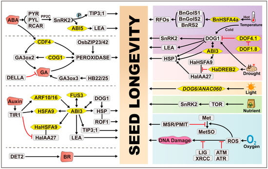 Temperature-sensitive gene DOG1 (DELAY OF GERMINATION 1), a key regulator of seed dormancy in Arabidopsis, also plays a significant role in seed longevity [41]. DOG1 promotes longevity by upregulating genes involved in stress responses, such as heat-shock proteins (HSPs) and late embryogenesis abundant proteins (LEAs). This regulation occurs partly through the activation of ABI5 expression and in coordination with ABI3 signaling [112]. Notably, DOG1 protein levels are influenced by seed maturation temperature, and loss of DOG1 function impairs seed dormancy induction at low maturation temperatures [113,114]. These findings suggest that DOG1 may orchestrate seed longevity responses to temperature through similar molecular mechanisms.