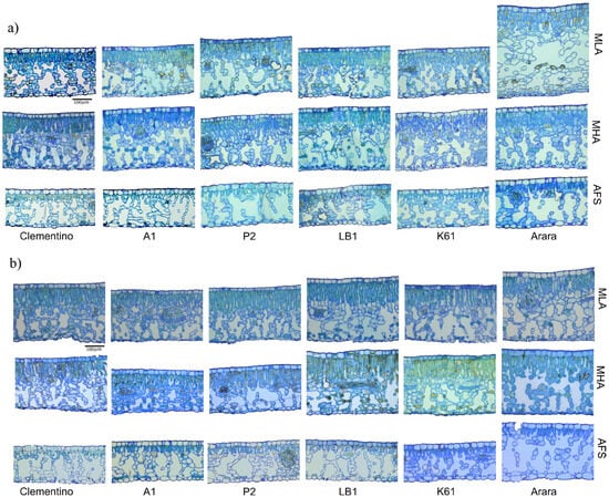 Optical microscopy images of leaf blades of different Coffea spp. genotypes evaluated under three managements, in two seasons. (a) Summer; (b) winter. MLA, full-sun monoculture at low-altitude; MHA, full-sun monoculture at high altitude; AFS, low-altitude agroforestry system.