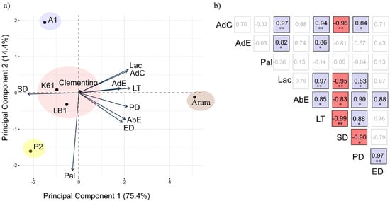 The magnitude of the correlations indicated by PCA was estimated using Pearson’s correlation coefficient, indicating strong negative correlations among SD and AdC, Spo, AbE, LT, and PD (Figure 3b). No correlation of Pal with the other traits was detected. AdC was strongly positively correlated with Spo, LT, and PD, while AdE only had a strong positive correlation with Lac and LT. In addition, Lac was strongly positively correlated with LT and PD, while AbE was strongly positively correlated with LT, PD, and ED. Finally, LT was strongly positively correlated with PD, and PD was strongly positively correlated with ED (Figure 3b).