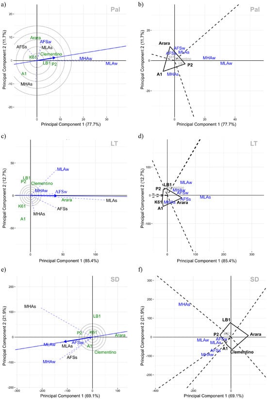 Biplot (GGE-Biplot) to assess discriminating power of environments and adaptability of genotypes expressed in leaf anatomical traits of Coffea spp.: (a) discriminating power and representativeness of environments for Pal—palisade parenchyma (μm); (b) adaptability of genotypes (which-won-where) regarding Pal breeding values (BLUPs); (c) discriminating power and representativeness of environments for LT—leaf thickness (μm); (d) adaptability of genotypes (who-won-where) regarding LT breeding values; (e) discriminating power and representativeness of environments for SD—stomatal density (number of stomata per mm2); (f) adaptability of genotypes (which-won-where) regarding SD breeding values. MLA—full-sun monoculture at low-altitude; MHA—full-sun monoculture at high altitude; AFS—low-altitude agroforestry system.