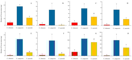 Stem biomass produced by C. chinensis, C. campestris, and C. australis parasitising eight different host species. Panels (A–H) represent the parasitism of the three Cuscuta species from the subg. Grammica on the corresponding host species, as follows: (A) Bidens pilosa; (B) Bidens biternata; (C) Ageratina adenophora; (D) Eupatorium heterophyllum; (E) Solidago canadensis; (F) Solidago decurrens; (G) Phytolacca americana; (H) Phytolacca acinosa. The significance level was set at p < 0.05. The lines in the bar charts represent the standard error of the mean (SEM) for each data group. The lowercase letters on each bar represent the significance between groups. If a bar shares the same letter with another bar, it indicates that there is no significant difference between them. If all the letters on one bar differ from those on another bar, it indicates a significant difference between the two.