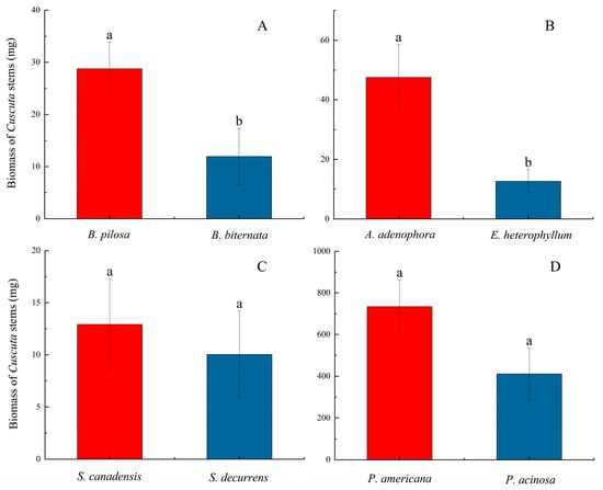 Total biomass of subg. Grammica species parasitizing non-native American hosts and native hosts from China. (A) represents the species pair B. pilosa and B. biternata; (B) represents the species pair A. adenophora and E. heterophyllum; (C) represents the species pair S. canadensis and S. decurrens; (D) represents the species pair P. americana and P. acinosa. The red bar represents the total biomass of subg. Grammica species parasitizing non-native American hosts. The blue bar represents the total biomass of subg. Grammica species parasitizing native hosts. Statistical significance was set at p < 0.05. The lines in the bar charts represent the standard error of the mean (SEM) for each group of data. The lowercase letters on each bar represent the significance between groups. If a bar shares the same letter with another bar, it indicates that there is no significant difference between them. If all the letters on one bar differ from those on another bar, it indicates a significant difference between the two.