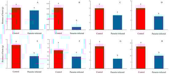Relative total biomass of hosts in the uninfected (control) and infected groups. Panels (A–H) represent 8 host species, as follows: (A) B. pilosa; (B) B. biternata; (C) A. adenophora; (D) E. heterophyllum; (E) S. canadensis; (F) S. decurrens; (G) P. americana; (H) P. acinosa. The red bar represents the relative total biomass of hosts in the uninfected (control) group. The blue bar represents the relative total biomass of hosts in the infected group. Statistical significance was set at p < 0.05. The lines in the bar charts represent the standard error of the mean (SEM) for each group of data. The lowercase letters on each bar represent the significance between groups. If a bar shares the same letter with another bar, it indicates that there is no significant difference between them. If all the letters on one bar differ from those on another bar, it indicates a significant difference between the two.