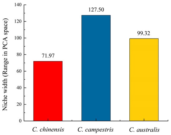 Niche breadth of C. chinensis, C. campestris, and C. australis in the environmental factor PCA space.