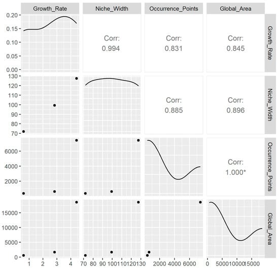To analyze the effects of growth rate, niche breadth, the number of global occurrence points, and global distribution area, the “ggpairs()” function in R version 4.2.1 [23] was used to construct a scatterplot matrix. This was followed by a comparative analysis of the performance of C. chinensis, C. campestris, and C. australis across these indicators, including growth rate, niche breadth, number of global occurrence points, and global distribution area.