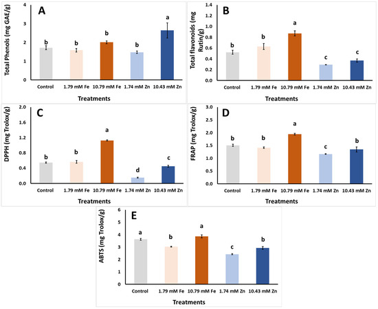 Effects of foliar applications (foliar with dH2O—control, 1.79 mM Fe, 10.79 mM Fe, 1.74 mM Zn and 10.43 mM Zn) on Sideritis cypria on (A) total phenols (mg gallic acid equivalents/g of fresh weight, mg GA/g FW); (B) flavonoids (mg rutin/g FW); and antioxidant activity as assayed by (C) 2,2-diphenyl-1-picrylhydrazyl (DPPH), (D) ferric reducing antioxidant power (FRAP) and (E) 2,2′-azino-bis(3-ethylbenzothiazoline-6-sulphonic acid (ABTS) (mg Trolox/g FW) in plants grown in hydroponics, with NPK values of 150-50-350 mg/L. Significant differences (p < 0.05) among foliar applications are represented by different letters.