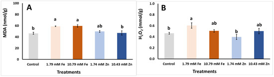 Effects of foliar applications (foliar with dH2O—control, 1.79 mM Fe, 10.79 mM Fe, 1.74 mM Zn and 10.43 mM Zn) on Sideritis cypria on (A) lipid peroxidation—MDA (nmol/g); (B) hydrogen peroxide—H2O2 (μmol/g); and enzymatic antioxidant activity of (C) superoxide dismutase—SOD (units/mg protein), (D) catalase—CAT (units/mg protein) and (E) peroxidase—POD (units/mg protein), in plants grown in hydroponics, with NPK values of 150-50-350 mg/L. Significant differences (p < 0.05) among foliar applications are represented by different letters. ns: no significant differences.