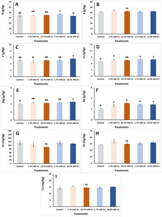 Effects of foliar applications (foliar with dH2O—control, 1.79 mM Fe, 10.79 mM Fe, 1.74 mM Zn and 10.43 mM Zn) on Sideritis cypria macronutrient [(A) nitrogen—N, (B) potassium—K, (C) phosphorus—P, (D) calcium—Ca, (E) magnesium—Mg and (F) sodium—Na] and micronutrient [(G) iron—Fe, (H) zinc—Zn and (I) copper—Cu] contents in plants grown in hydroponics, with NPK values of 150–50–350 mg/L. Significant differences (p < 0.05) among foliar applications are represented by different letters. ns: no significant differences.