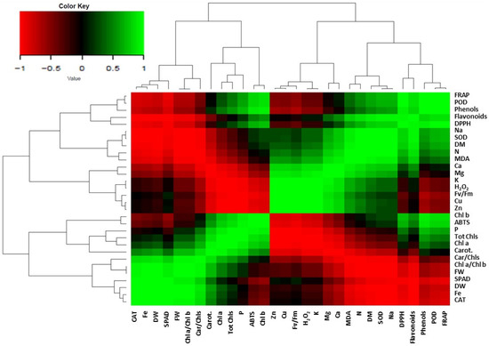 The correlation matrix of the plant growth and physiological traits is presented in Figure 5. Among the parameters that were activated, positive correlations were found for the increased fresh weight with the increased dry weight, Fe content, SPAD and CAT enzymatic activity. The above parameters were negatively correlated with the total phenols; flavonoids; antioxidant status; and N, Na and Ca content. Additionally, the Zn content in the plant tissue was positively correlated with the chlorophyll fluorescence and Cu, K, Mg and Ca content but negatively correlated with the P content.