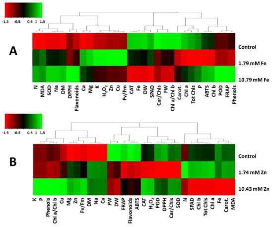 Metabolite changes in Sideritis cypria. Heat map representing relative expressions of growth and physiological traits elicited in plant tissue following foliar applications (A) with Fe and (B) with Zn as compared with control (water-sprayed) plants.