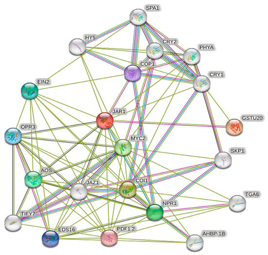 - Ortigosa, A.; Fonseca, S.; Franco-Zorrilla, J.M.; Fernandez-Calvo, P.; Zander, M.; Lewsey, M.G.; Garcia-Casado, G.; Fernandez-Barbero, G.; Ecker, J.R.; Solano, R. The JA-pathway MYC transcription factors regulate photomorphogenic responses by targeting HY5 gene expression. Plant J. 2020, 102, 138–152. [Google Scholar] [CrossRef]