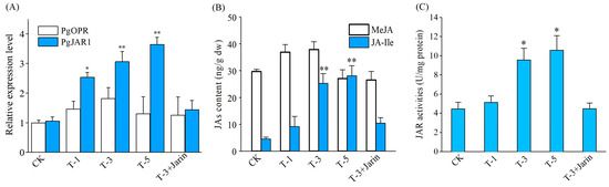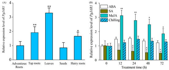 2.4. Expression Pattern of PgJAR1 in P. ginseng