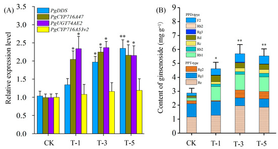 2.7. PgJAR1-Mediated PgSS, PgDDS, CYP, and UGT Expression and Ginsenoside Biosynthesis