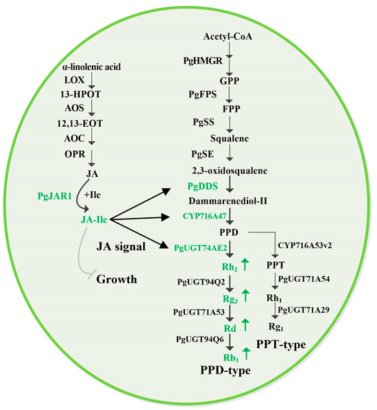 Chicago/Turabian StyleZhang, Ru, Chao Li, Rui Guo, Zhaoying Li, and Bianling Zhang. 2025. "Harnessing Jasmonate Pathways: PgJAR1’s Impact on Ginsenoside Accumulation in Ginseng" Plants 14, no. 6: 847. https://doi.org/10.3390/plants14060847