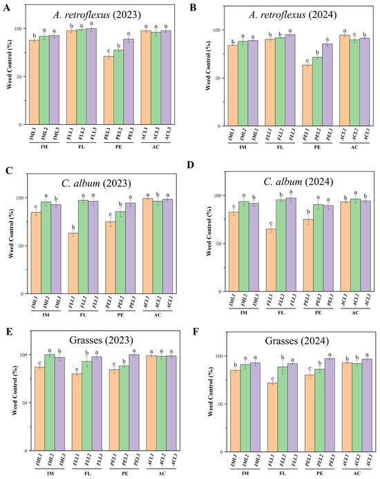 Effect of pre-emergence herbicides on weed control (%) in different treatments at 30 DAS for A. retroflexus in (A) 2023 and (B) 2024; C. album in (C) 2023 and (D) 2024; and grasses in (E) 2023 and 2024 (F). Pre-emergence herbicides imazethapyr (IM, IML1, IML2 and IML3 denote different concentrations), flumetsulam (FL, FLL1, FLL2, FLL3 denote different concentrations), acetochlor (AC, ACL1, ACL2, ACL3 denote different concentrations), and pendimethalin (PE, PEL1, PEL2, PEL3 denote different concentrations). All treatments were measured with three replications. Different letters indicate significant differences between treatments (Duncan test at p < 0.05).
