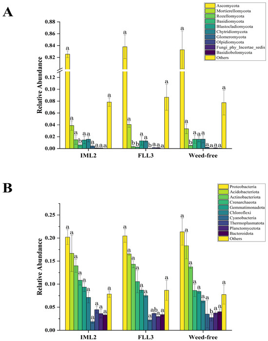 Column chart of relative abundances (%) of fungi (A) and bacteria (B) at the phylum level in the weed-free (control), IML2, and FLL3 treated soil samples. All treatments were measured with three replications. Different letters indicate significant differences between treatments (Duncan test at p < 0.05).
