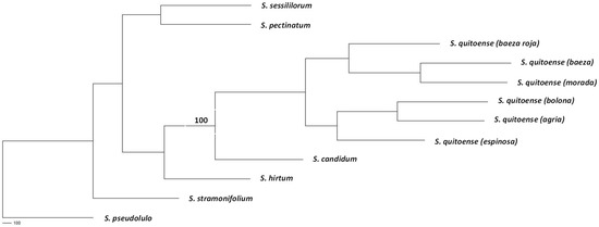 The multivariate analysis (Figure 2) corroborates Lasiocarpa species differentiation from S. quitoense varieties. Bolona and Baeza roja appeared more differentiated from the rest of the S. quitoense samples. In terms of the Lasiocarpa species, S. candidum, S. hirtum, and S. sessiliflorum are located closer to S. quitoense. The analysis revealed that S. stramonifolium, S.pseudolulo, and S. pectinatum were more divergent.