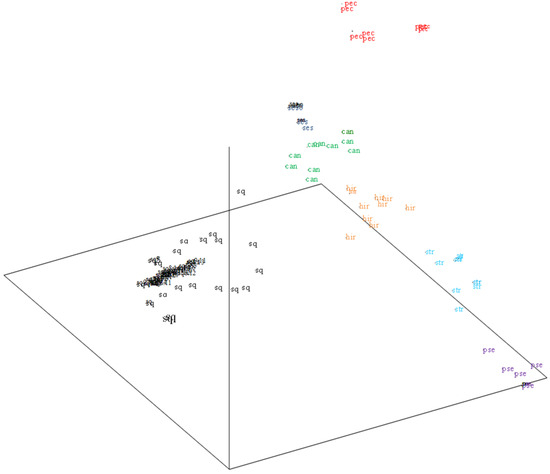 PCO analysis showing the dispersion of the 120 genotyped Lasiocarpa samples based on SSR polymorphism. S. quitoense genome. sq: S. quitoense; can: S. candidum; hir: S. hirtum; str: S. stramonifolium; pse: S.pseudolulo; pec: S. pectinatum.