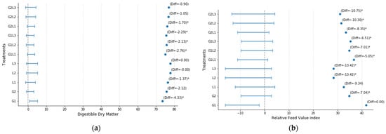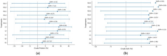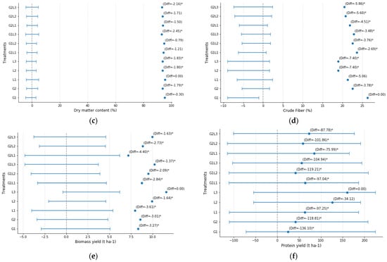 According to the results of Hsu’s Multiple Comparisons with the Best (MCB) test for DDM, significant variations were observed among treatments (Figure 2a). The mean DDM values ranged from 73.51% (G1) to 77.84% (L3). Several treatments, including G1 (−4.33), G1L1 (−2.76), G1L2 (−2.13), G1L3 (−2.293), and G2L1 (−1.697), exhibited significantly lower DDM content compared to the highest-performing treatment (L3). Among the monocrops, L3 recorded the highest DDM value (77.84%), while G1 had the lowest, with a significant difference. Intercropping treatments such as G2L2 (−1.053) and G2L3 (−0.903) showed smaller differences from the highest-performing treatments and were not statistically significant.