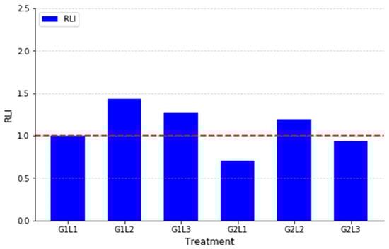 Interestingly, G1L1 (1.00) had an RLI of exactly 1, meaning that the intercropping combination did not significantly alter LAI efficiency compared to its individual monocrops.