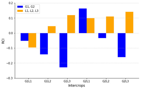 Interestingly, G1L1 (−0.052, −0.097) showed a relatively balanced competition, suggesting the mild suppression of both species in this combination. This indicates that Rye (G1) and Bean (L1) coexisted with moderate competition stress, making this mixture more stable compared to the strongly competitive interactions in the other intercropping treatments. Based on the RCI index, it is evident that the intensity of competition varies depending on the intercropping combination. Some species, particularly Bean (L1), Clover (L2), and inoculated Clover (L3), were more likely to suppress the grasses in certain treatments, whereas the grasses in the other systems (e.g., G2L1) maintained dominance over the legumes.