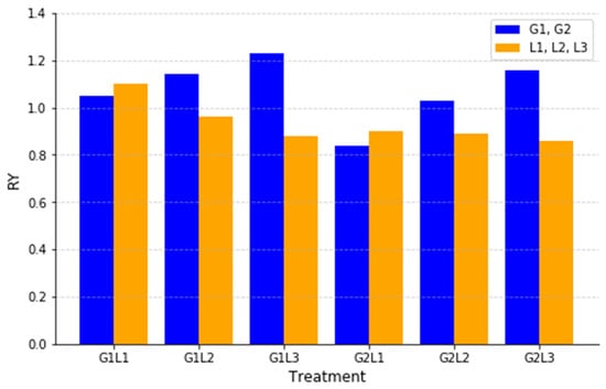 In general, the grasses (G1, G2) exhibited higher RY values than the legumes in most treatments, indicating that the grasses performed better in intercropping than in monocropping. The highest RY(G) values were observed in G1L3 (1.23) and G2L3 (1.16), suggesting that Rye (G1) and Lolium (G2) had the greatest competitive advantage when intercropped with inoculated Clover (L3). Similarly, G1L2 (1.14) and G2L2 (1.03) showed positive RY values for grasses, indicating that Clover (L2) did not strongly suppress their growth.