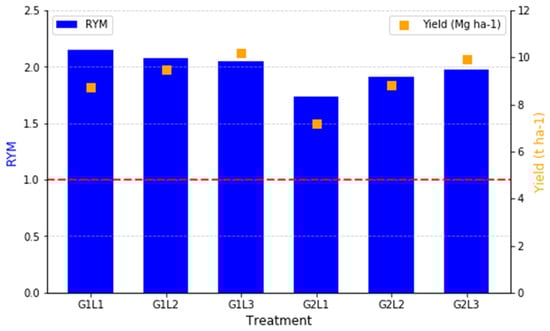 Relative Yield Monoculture (RYM) and Biomass Yield (BY) for intercropping treatments. The red line at 1.0 represents the threshold where intercropping and monocropping perform equally, with values above 1.0 indicating a yield advantage for intercropping.
