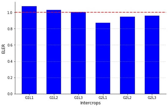 The ELER values indicate that the intercropping systems involving G1 tended to be more economically advantageous compared to those involving G2. The G2L3 combination, with an ELER of 0.970, approached the economic efficiency threshold but did not surpass it, reinforcing that monoculture remains a more viable option in this case.