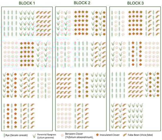 Grasses such as Rye and Perennial Ryegrass were selected due to their high biomass productivity, competitive growth, and ability to improve soil structure. The legumes, including Berseem Clover and Faba Bean, were incorporated for their nitrogen-fixing ability, which enhances soil fertility, reducing the need for synthetic fertilizers. The inoculated Clover was specifically used to evaluate the impact of biological nitrogen fixation in improving overall forage quality. The inoculated Clover was inoculated with Rhizobium trifolii, a bacterial strain commonly used for nitrogen fixation in legume crops. The inoculation process ensured that the clover formed an effective symbiotic relationship with the rhizobia, enhancing biological nitrogen fixation and improving plant growth without the need for synthetic fertilizers.