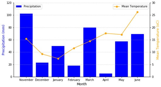The climatic conditions of the site, including precipitation and average temperature, are presented in Figure 9. The graph illustrates the monthly mean temperature (°C) and total precipitation (mm) recorded between November 2016 and May 2017, which correspond to the crop-growing period. The total precipitation for this period was 317.7 mm. These climatic factors are critical for understanding the environmental conditions under which the intercropping and monocropping systems were evaluated.