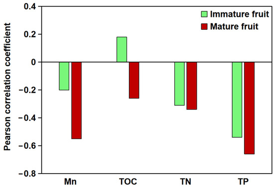 Pearson correlation analysis between soil elements (Mn, TOC, TN, and TP) and total flavonoid content in B. papyrifera fruits. The X-axis denotes various soil elements, while the Y-axis indicates the correlation coefficient.
