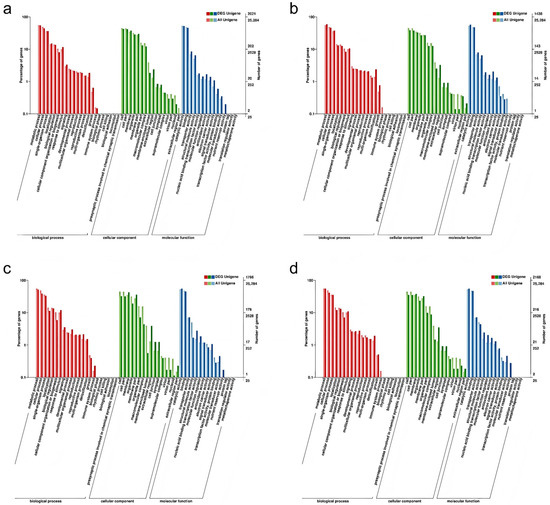 GO enrichment analysis of DEGs in three categories: biological process, cellular component, and molecular function. (a) CIF vs. GIF. (b) CMF vs. GMF. (c) CIF vs. CMF. (d) GIF vs. GMF. The most significantly enriched terms for each category are presented. Bar length represents the number of DEGs assigned to each term.