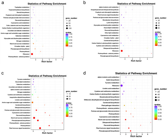 KEGG pathway analysis showed that 1128, 750, 828, and 1069 DEGs were annotated to KEGG pathways in the CIF vs. GIF, CMF vs. GMF, CIF vs. CMF, and GIF vs. GMF comparisons, respectively; these DEGs were annotated to 113, 102, 109, and 115 KEGG pathways, respectively. Figure 5 shows the 20 most significantly enriched KEGG pathways in the four comparison groups. In the comparison between CIF and GIF (Figure 5a), the three most significantly enriched KEGG pathways were photosynthesis–antenna proteins, ribosomes, and photosynthesis pathways. Similarly, in the comparison between CMF and GMF (Figure 5b), the top three pathways were phenylpropanoid biosynthesis, photosynthesis–antenna proteins, and ribosomes. In the comparison between CIF and CMF (Figure 5c), the top three KEGG pathways were plant hormone signal transduction, photosynthesis, and photosynthesis–antenna proteins. In the comparison between GIF and GMF (Figure 5d), the top three KEGG pathways were phenylpropanoid biosynthesis, plant hormone signal transduction, and flavonoid biosynthesis.