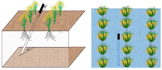 The water source for the drip irrigation system is well water, which is either used directly or after undergoing a sun-drying process. During the entire rice-growing period (2023 and 2024), an average of 40 drip irrigation events were conducted, with intervals of 2–4 days and a total amount of 10,980 m3·ha−1. The irrigation schedule is as follows: 2 events during the sowing period, each applying 300 m3·ha−1; 10 events during the seedling stage, each applying 300 m3·ha−1; 10 events during the tillering stage, each applying 280 m3·ha−1; 5 events during the heading stage, each applying 260 m3·ha−1; 3 events during the flowering stage, each applying 260 m3·ha−1; and 10 events during the grain-filling period, each applying 250 m3·ha−1. The drip irrigation runoff rate was 2.0 h·L−1, and soil moisture was monitored using Time Domain Reflectometry (TDR) technology (TRIME-TDR, IMKO, Ettlingen, Germany), which guided irrigation management. Irrigation was initiated when soil moisture content fell below the predetermined threshold for each treatment, and a water meter was installed to measure irrigation volume.