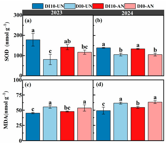 Figure 3. Effects of different drip irrigation depths and N forms on MDA and SOD in rice leaves during the grain-filling stage from 2023–2024. (a): SOD content during the grain-filling stage in 2023; (b): SOD content during the grain-filling stage in 2024; (c): MDA content during the grain-filling stage in 2023; (d): MDA content during the grain-filling stage in 2024. Different lowercase letters within the same column indicate significant differences between treatments (p < 0.05; LSD). DI0-UN: Conventional surface drip irrigation with urea N management; DI10-UN: Subsurface drip irrigation at 10 cm depth with urea N management; DI0-AN: Conventional surface drip irrigation with ammonium N management; DI10-AN: Subsurface drip irrigation at 10 cm depth with ammonium N management.