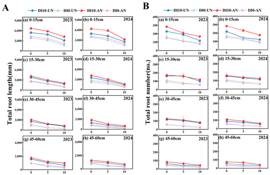 Figure 5. Dynamic changes in root length and root number decay across soil layers during the grain-filling stage under varying drip irrigation depths and N forms. (A): Total root length; (B): Total root number. Treatment abbreviations: DI0-UN: Conventional surface drip irrigation with urea N management; DI10-UN: Subsurface drip irrigation at 10 cm depth with urea N management; DI0-AN: Conventional surface drip irrigation with ammonium N management; DI10-AN: Subsurface drip irrigation at 10 cm depth with ammonium N management. The numbers 5, 10, and 15 denote the 5th, 10th, and 15th days of observation during the grain-filling stage.