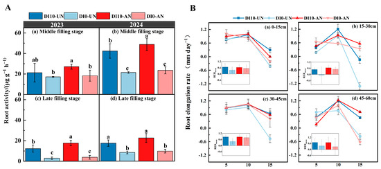 Figure 6. Changes in daily root elongation rate and root activity under different drip irrigation depths and N forms. (A): Root activity during the grain-filling stage from 2023–2024. (B): Dynamic changes in daily root elongation rate during the grain-filling stage in 2024. Treatment abbreviations: DI0-UN: Conventional surface drip irrigation with urea N management; DI10-UN: Subsurface drip irrigation at 10 cm depth with urea N management; DI0-AN: Conventional surface drip irrigation with ammonium N management; DI10-AN: Subsurface drip irrigation at 10 cm depth with ammonium N management. The numbers 5, 10, and 15 denote the 5th, 10th, and 15th days of observation. Different lowercase letters indicate significant differences between treatments (p < 0.05; LSD).