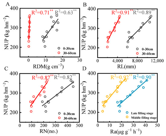 Figure 7. Correlation analysis between root morphology, root activity, and N uptake during the grain-filling stage (2023–2024). Note: ** indicates p < 0.01. (A): Correlation analysis between NUP and RDM. (B): Correlation analysis between NUP and RL. (C): Correlation analysis between NUP and RN. (D): Correlation analysis between NUP and Ra. Abbreviations: NUP: N uptake; RDM: Root dry matter; RL: Total root length; RN: Total root number; Ra: Root activity.