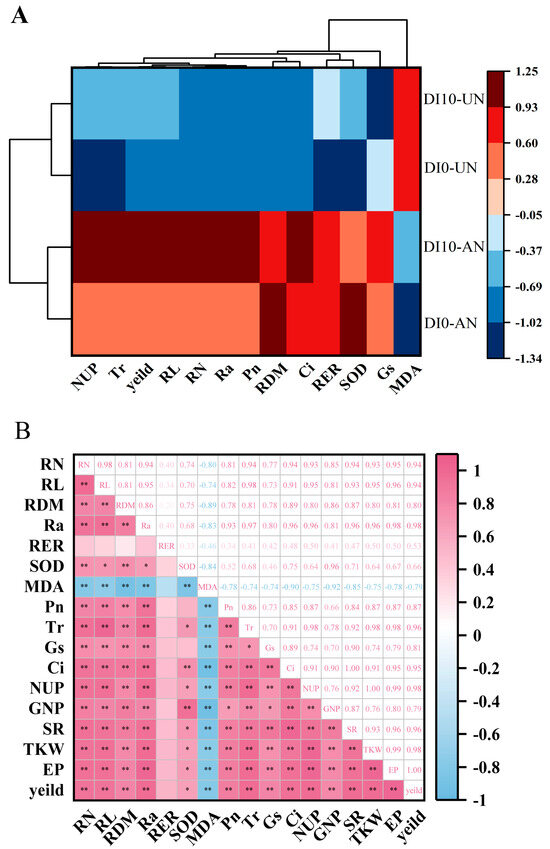 Figure 8. Cluster analysis and Pearson correlation analysis of various rice indicators (2023–2024). Data are presented as means (n = 3); * indicates significant correlation at p < 0.05; ** indicates significant correlation at p < 0.01. (A): the cluster analysis among indicators; (B): Pearson correlation analysis between indicators. Treatment abbreviations: DI0-UN: Conventional surface drip irrigation with urea N management; DI10-UN: Subsurface drip irrigation at 10 cm depth with urea N management; DI0-AN: Conventional surface drip irrigation with ammonium N management; DI10-AN: Subsurface drip irrigation at 10 cm depth with ammonium N management. Indicator abbreviations: RDM: Root dry matter; RL: Total root length; RN: Total root number; Ra: Root activity; RER: Root elongation rate; NUP: N uptake; GNP: Grain number per panicle; SR: Seed setting rate; TKW: 1000-kernel weight; EP: Efficient panicle.