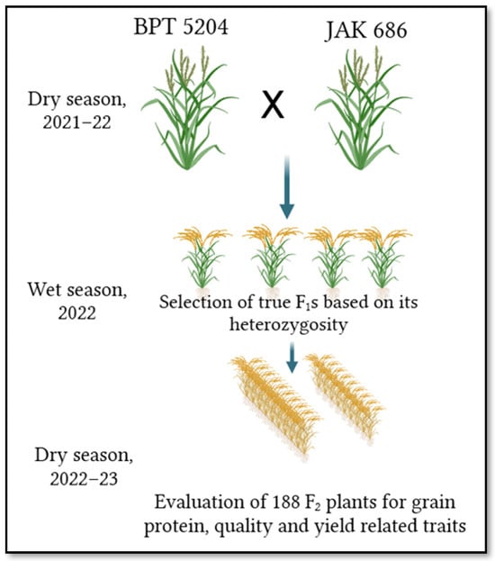 Breeding scheme for development of F2 population from BPT 5204 X JAK-686 cross.