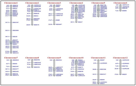 We extracted DNA from leaf samples using the CTAB method and assessed its quality and quantity using a UV spectrophotometer at both 260 nm/280 nm and 260 nm/230 nm. Genomic DNA was isolated from 188 fresh leaf samples using the CTAB method, and the F2 population was genotyped. We used a working DNA concentration of 40 ng/µL for genotyping. A set of 1280 markers, comprising 1220 SSRs and 60 InDels, evenly distributed across the rice genome were used to study parental polymorphism. The SSR and InDel markers which have been previously reported in the universal core genetic map for rice [], the genome-wide InDel marker set for allele discrimination between rice (Oryza sativa), and the other seven AA-genome Oryza species [], respectively, were used for the polymorphism study between parents. Some SSR markers for the rice genome were retrieved from the Gramene Marker Database (https://gramene.org/archive (accessed on 27 December 2022)). Markers were selected from all 12 chromosomes of rice (Oryza sativa L.) to ensure comprehensive genome-wide coverage.