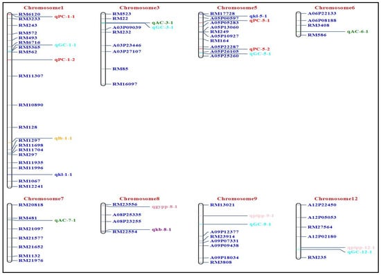 Additionally, we identified two QTLs for KL: qkl1.1 and qkl5.1 on chromosomes 1 and 5, respectively. qkl1.1 and qkl5.1, with LOD scores of 2.86 and 4.77, respectively, explaining 9.63% and 4.24% of the PVE. A single QTL was identified each for KB (qkb8.1) and L:B (qlb1.1) on chromosomes 8 and 1, respectively. qkb8.1 and qlb1.1, with LOD scores of 3.30 and 2.51, respectively, explained 7.79% and 6.19% of the PVE. We have also identified two QTLs, qptpp9.1, and qptpp12.1, for PTPP on chromosome 9 and 12, respectively; qptpp9.1 and qptpp12.1, with LOD scores of 4.34 and 3.55, respectively, explained 5.65% and 5.78% of the PVE. Further, qgypp8.1, a QTL for GYPP with an LOD value of 2.57, explained 6.07% of the PVE.