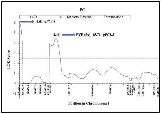 We identified four QTLs (qPC1.1, qPC1.2, qPC5.1, and qPC5.2) affecting GPC in milled rice, two each on chromosome 1 and chromosome 5. qPC1.2, in the marker interval RM562-RM11307, explained 15.7% of the phenotypic variance. Zhong et al. (2011) [] reported two QTLs (qPr1 and qPr7) for GPC in milled rice in the marker interval RM493-RM562 and RM445-RM418. The qPr1 allele from Zhenshan 97B reduced the GPC, while qPr7 increased the GPC of milled rice. Earlier research has identified numerous QTLs associated with GPC, mostly in brown rice [,,,]. Several QTLs for GPC in brown rice were identified using different types of populations, including ‘Recombinant Inbred Lines (RILs)’ [,] and a ‘Doubled Haploid (DH)’ population []. Though these are interesting results, in most of the studies, parents exhibited a narrow range for GPC. In contrast, the parents utilized in the present study showed significant variation for GPC in milled rice, aiding in a more accurate QTL mapping of genomic regions governing GPC. Identifying QTLs in brown rice is useful, but milled rice is more important, as consumers eat brown rice less frequently than milled rice. Further, although researchers have detected numerous QTLs for GPC using different mapping populations, they have characterized only a few. Peng et al. (2014) [] cloned and validated the qPC1 locus identified by Wang et al. (2008) [].